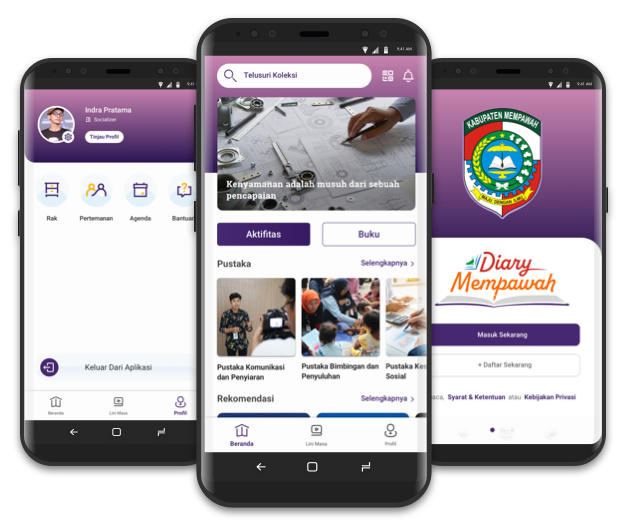 Laman utama aplikasi Diary Mempawah, Laman utama terdiri dari banner berisikan visual post atau iklan, jenis koleksi kumpulan buku bacaan selanjutnya dibawah adalah card koleksi berdasarkan kategori dan dibagian paling bawah adalah menu utama. Menu utama dapat digunakan pengguna untuk melihat aktivitas, layanan Layanan Perpustakaan Digital, layanan Diary Mempawah, koleksi buku, detail buku, peminjaman buku, list epustaka, melihat banner, pencarian, melihat notifikasi, mengakses halaman lainnya, seperti lini masa dan profil pengguna.